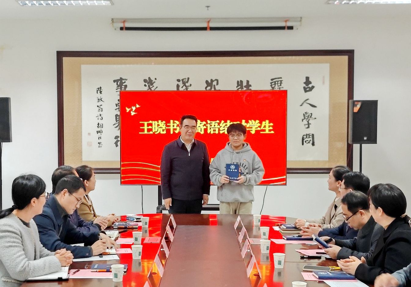 “过去一年,我在王晓书记的关怀引领下,思想与学业同步提升,获11项学科竞赛荣誉并成为中共预备党员。”会上,三名结对学生代表分享了成长经历,表达了对学校和老师们的诚挚感谢。在“笔墨寄情”环节,结对老师还为学生题写专属寄语、赠送学习笔记本,并围绕学习、生活、学科竞赛、考研等展开深入交流。