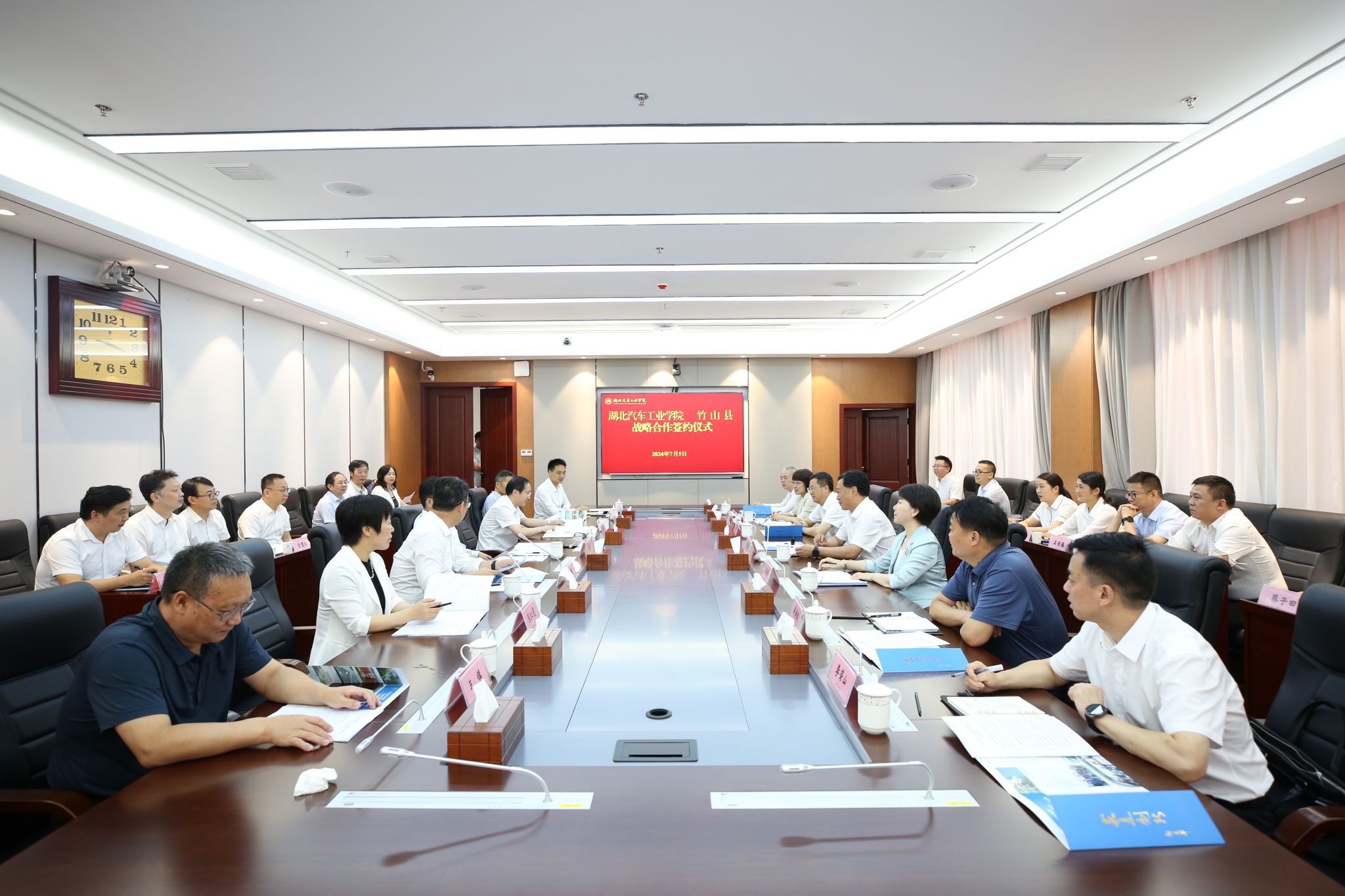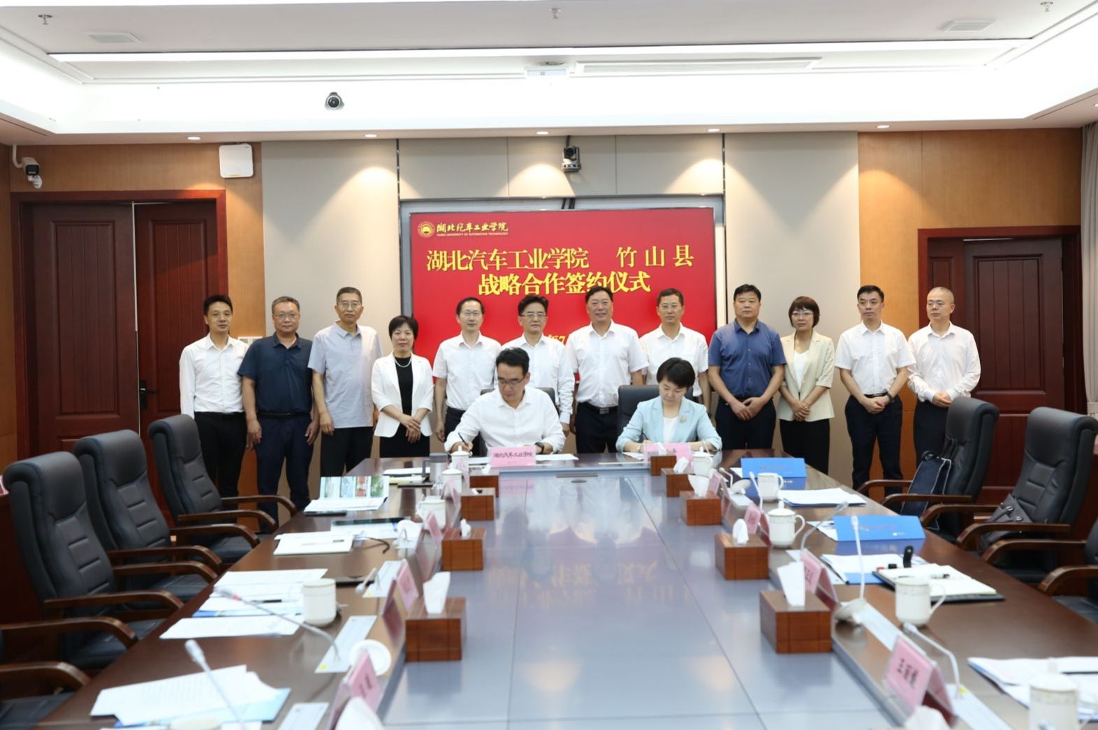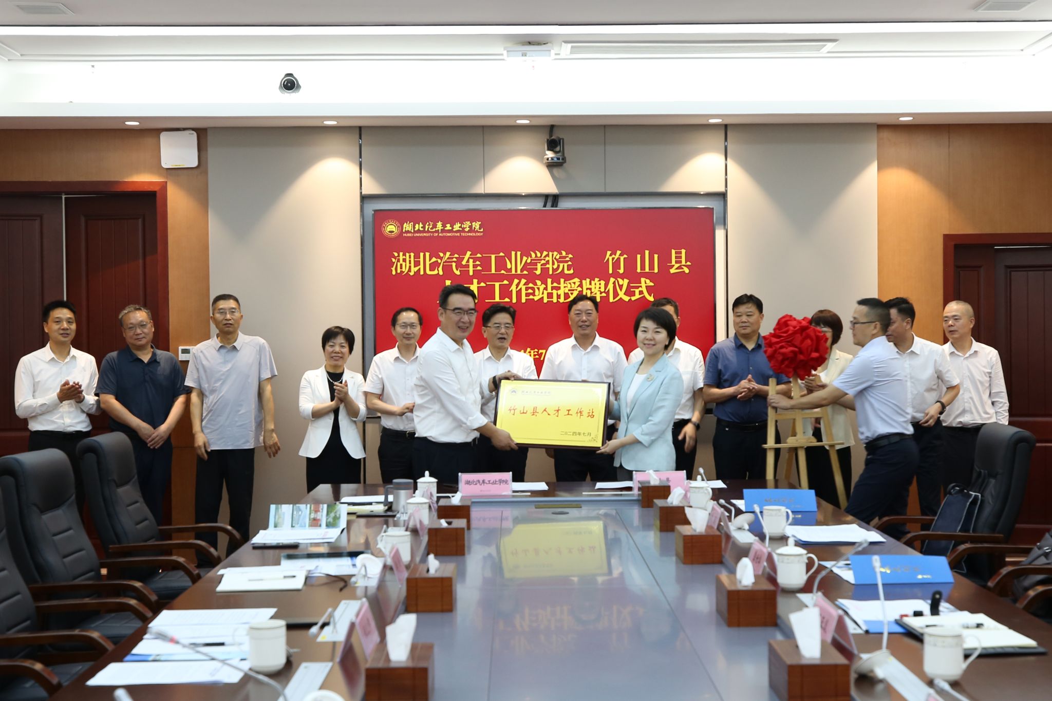 本网讯(文 常金星/图 李一凡)7月5日上午,竹山县委书记汪正义,县委副书记、县长王丽媛,政协主席龚世华,竹山县委常委、宣传部长李金柱,副县长刘丽一行莅临我校签署战略合作协议、举行“人才工作站”授牌仪式。党委书记张文学,校长王晓,党委副书记李涛,副校长张红霞,工会主席陈海峰,党委常委、组织部长王镇,党委常委、党政办公室主任王文山出席签约仪式。会议由王晓主持。